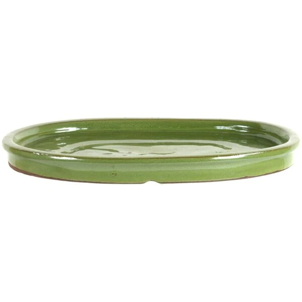 Bonsai Untersetzer (glasiert, hellgrün, oval) in den Abmessungen: 29.5cm Länge, 22cm Breite, 2.5cm Höhe. Im Giessverfahren hergestellt. Gute Standardqualität aus der Töpferstadt Yixing.