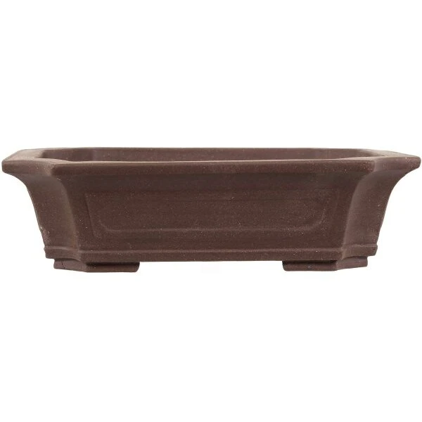 Bonsaischale (unglasiert, braun, rechteckig), handgemacht, in den Abmessungen: 27.5cm Länge, 22cm Breite, 7.5cm Höhe.