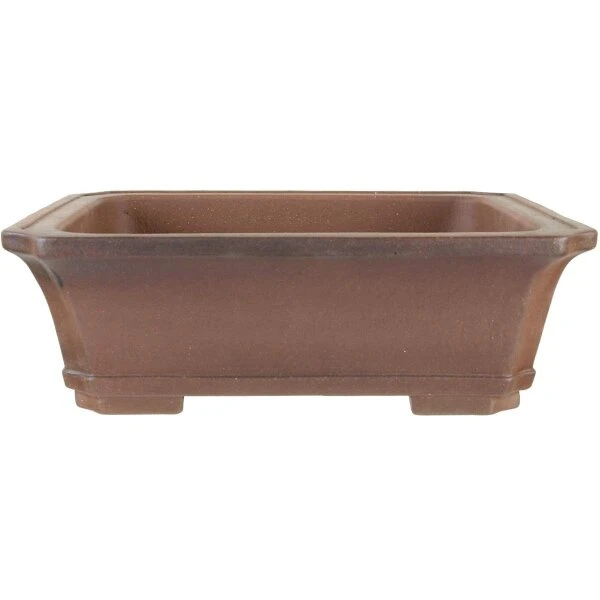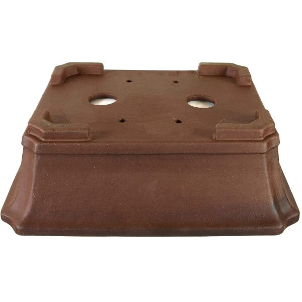 Bonsaischale (unglasiert, antik-braun, rechteckig), handgemacht, in den Abmessungen: 33cm Länge, 28cm Breite, 11cm Höhe.
