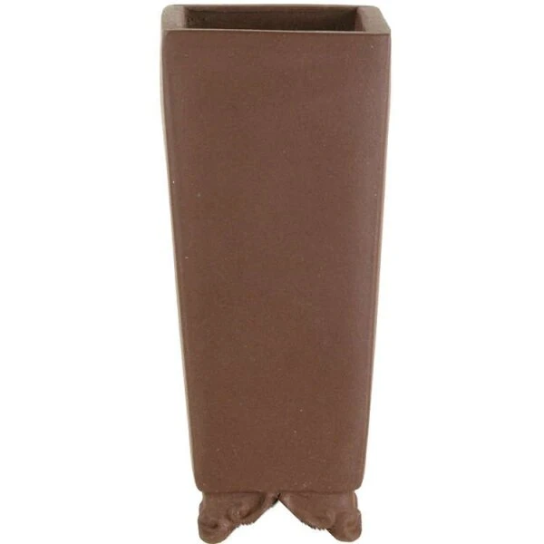Bonsaischale (Unglasiert, Dunkelbraun, Quadratisch) in den Abmessungen: 4.2cm Länge, 4.2cm Breite, 9.6cm Höhe.