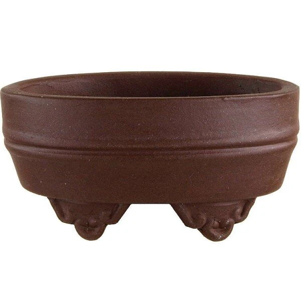 Bonsaischale (Unglasiert, Dunkelbraun, Oval) in den Abmessungen: 7.2cm Länge, 4.2cm Breite, 3.5cm Höhe.