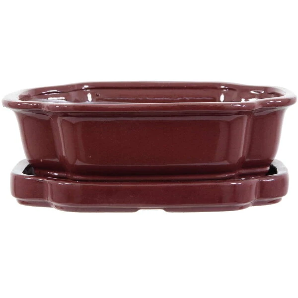 Bonsaischale mit Untersetzer (glasiert, weinrot, sonstige form) in den Abmessungen: 25cm Länge, 20cm Breite, 8cm Höhe. Gute Standardqualität aus der Töpferstadt Yixing.