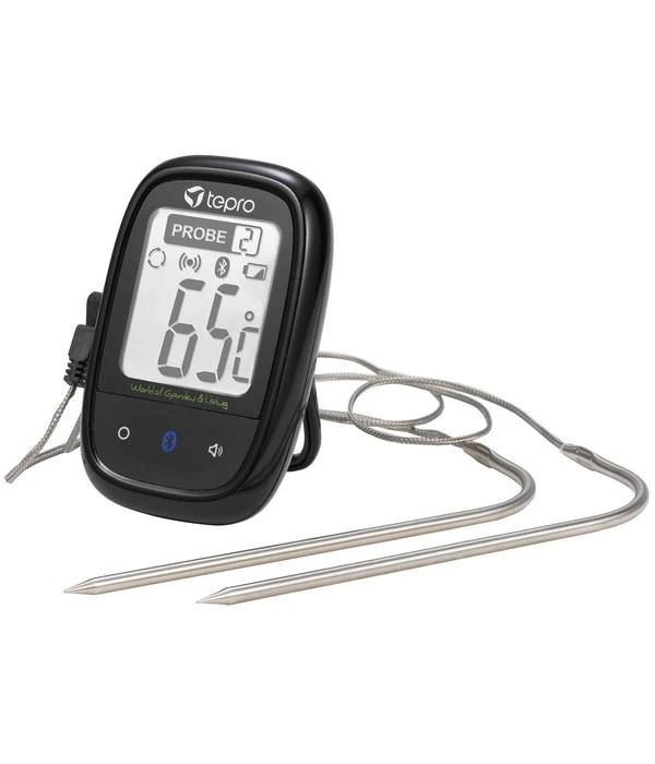 Das tepro Bluetooth Grillthermometer erlaubt es Ihnen, die Temperatur Ihres Fleisches während des Grillens exakt zu überwachen. Wählen Sie Ihre individuelle Zieltemperatur und sitzen Sie dank Bluetooth-Funktion ganz entspannt bei Ihren Gästen, während Ihr Grillgut am Rost langsam seinen köstlichen Duft verbreitet. Mit der inkludierten Grill-App erhalten Sie alle Daten in Echtzeit und erfahren per Signal, wann Ihr Fleisch fertig ist!