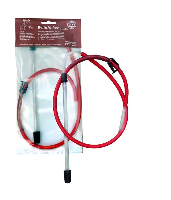 Zum einfachen Entnehmen von Wein aus z.B. einem Fass ist der Weinheber das ideale Hilfsmittel. Der flexible Schlauch lässt sich ganz einfach in Fässer oder Ballons einführen, nach kurzem Ansaugen können Sie den Fruchtwein abfüllen. Das durchsichtige Steigrohr ermöglicht es, die Färbung vorab zu beurteilen. Mit dem PE-Hähnchen wird der Weinheber wieder verschlossen. Der Vina Weinheber verfügt über ein verstellbares Ansaugrohr für eine Saughöhe bis ca. 65 cm.