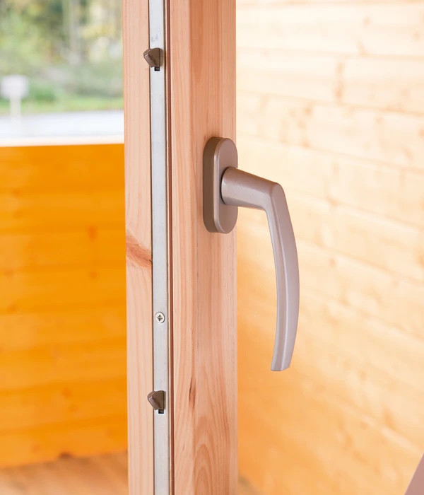 Die Glaselemente lassen viel Licht in den Innenraum des Wolff Finnhaus Gartenhaus Katrin 44-C fallen, was dem Raum eine einladende Atmosphäre verleiht. Außerdem sind alle Fensterelemente, auch die in der Tür, hochwertig isolierverglast. Die Fenster neben der Tür sind nicht zu öffnen, die beiden anderen haben einen Einhand-Dreh-/Kippmechanismus, so dass Sie den Innenraum gut lüften können. Die großzügige Doppeltür besteht aus hochwertigem Leimholz, das sich nicht verziehen wird und immer beste Funktionalität garantiert. Sie erhalten die Tür komplett mit Drückergarnitur, Einsteckschloss und Profilzylinder.